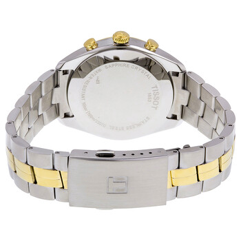 Stainless steel case with a two-tone (silver and gold PVD) stainless steel bracelet. Fixed gold PVD bezel. White dial with luminous gold-tone hands and index hour markers. Minute markers around the outer rim. Dial Type: Analog. Luminescent hands and markers. Date display between the 4 and 5 o'clock positions. Chronograph - three sub-dials displaying: 60 second, 30 minute and 1/10th of a second. Quartz movement. Scratch resistant sapphire crystal. Solid case back. Case diameter: 41 mm. Case thickness: 10.71 mm. Round case shape. Band width: 20 mm. Deployment clasp with a push button release. Water resistant at 100 meters / 330 feet. Functions: chronograph, date, hour, minute, second. Casual watch style. Tissot PR100 Chronograph White Dial Two-tone Men's Watch T1014172203100.