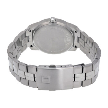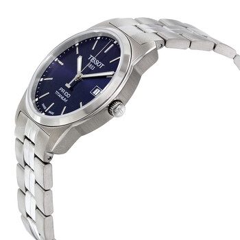 Titanium case with a titanium bracelet. Fixed titanium bezel. Blue dial with luminous hands and index hour markers. Minute markers around the outer rim. Luminescent hands and markers. Date display appears at the 3 o'clock position. Quartz movement. Scratch resistant sapphire crystal. Textured steel crown. Solid case back. Case diameter: 39 mm. Case thickness: 9 mm. Fold over clasp. Water resistant at 30 meters / 100 feet. Functions: hours, minutes, seconds, calendar.