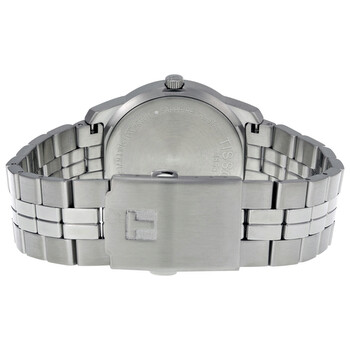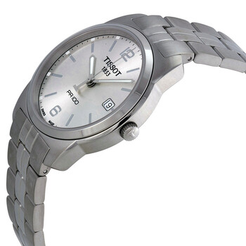 Stainless steel case with a stainless steel link bracelet. Fixed stainless steel bezel. Silver dial with luminous silver-tone hands and stick hour markers. Arabic numerals mark the 6 and 12 o'clock positions. Minute markers around the outer rim. Luminescent hands and markers. Date display appears at the 3 o'clock position. Swiss quartz movement. Scratch resistant sapphire crystal. Solid case back. Case diameter: 39 mm. Case thickness: 9 mm. Bracelet width: 20 mm. Push button deployment clasp. Water resistant at 100 meters / 330 feet. Functions: hours, minutes, seconds, date. Tissot PR100 Men's Watch T0494101103701.