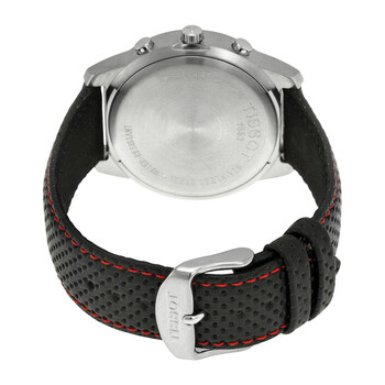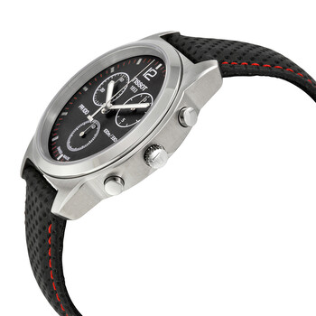 Stainless steel case with a perforated black synthetic leather strap. Fixed stainless steel bezel. Black dial with luminous silver-tone hands and index hour markers. An Arabic numeral marks the 12 o'clock position. Minute markers.The Tissot name appears below the 12 o'clock position. Dial Type: Analog. Luminescent hands. Date display appears at the 3 o'clock position. Chronograph - three sub-dials displaying: 60 seconds, 30 minutes and 1/10th of a second. Quartz movement. Scratch resistant sapphire crystal. Textured steel crown. Solid case back. Case diameter: 38.6 mm. Case thickness: 10.72 mm. Round case shape. Band width: 18 mm. Band length: Men's standard. Tang clasp. Water resistant at 100 meters / 330 feet. Functions: hours, minutes, seconds, chronograph, date. Casual watch style. Watch label: Swiss Made. Tissot PR100 Quartz Chronograph Men's Watch T0494171605700.