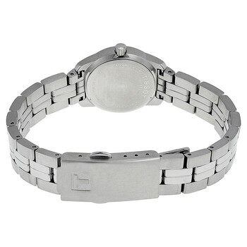 Stainless steel case with a stainless steel bracelet. Fixed stainless steel bezel. Silver dial with luminous hands and Arabic numeral hour markers. Minute markers around the outer rim. Dial Type: Analog. Luminescent hands and markers. Date display appears at the 3 o'clock position. Quartz movement. Scratch resistant sapphire crystal. Solid case back. Case diameter: 24.5 mm. Case thickness: 6.6 mm. Round case shape. Fold over clasp with push button release. Water resistant at 100 meters/ 330 feet. Functions: hours, minutes, seconds, date. Dress watch style. Watch label: Swiss Made. Tissot PR100 Silver DIal Stainless Steel Ladies Watch T0492101103200.