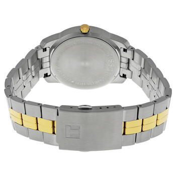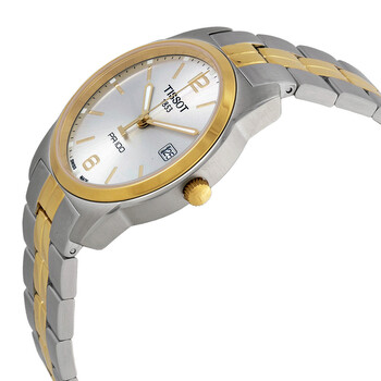 Stainless steel case with a two-tone (silver and gold-tone) stainless steel bracelet. Fixed gold-tone bezel. Silver dial with luminous gold-tone hands and index hour markers. Arabic numerals mark the 6 and 12 o'clock positions. Minute markers around the outer rim. Dial Type: Analog. Luminescent hands and markers. Date display at the 3 o'clock position. Quartz movement. Scratch resistant mineral crystal. Solid case back. Case diameter: 38 mm. Case thickness: 8.45 mm. Round case shape. Band width: 18 mm. Fold over clasp with safety release. Water resistant at 100 meters / 330 feet. Functions: date, hour, minute, second. Casual watch style. Watch label: Swiss Made. Tissot PR100 Silver Dial Two-tone Men's Watch T0494102203701.