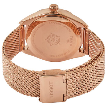 Rose gold 5N stainless steel case with a rose gold 5N stainless steel mesh bracelet. Uni-directional rotating rose gold 5N bezel. Pink mother of pearl dial with luminous rose gold-tone hands and index hour markers. Minute markers around the outer rim. Dial Type: Analog. Luminescent hands and markers. Date display at the 6 o'clock position. ETA 955.412 quartz movement. Scratch resistant sapphire crystal. Pull / push crown. Solid case back. Round case shape. Case size: 36 mm. Case thickness: 9 mm. Band width: 18 mm. Jewelry clasp. Water resistant at 100 meters / 330 feet. Functions: date, hour, minute, second. Casual watch style. Watch label: Swiss Made. Tissot PR100 Sport Chic Pink Mother of Pearl Dial Ladies Watch T101.910.33.151.00.