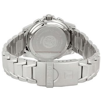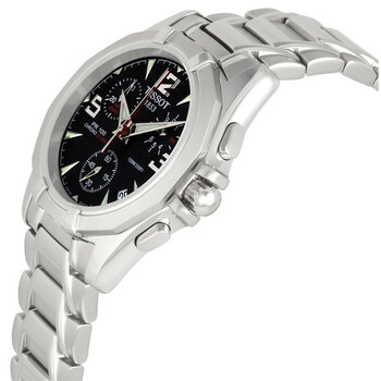 Stainless steel case and bracelet. Black dial with luminous hands and hour markers. Arabic numerals at the 3, 9 and 12 o'clock positions. Date displays between the 4 and 5 o'clock positions. Flyback chronograph with alarm function. Quartz movement. Scratch resistant sapphire crystal. Case size 40mm x 30mm. Case thickness 10.6mm. Fold-over clasp with push button safety. Water resistant at 100 meters (330 feet). Alternate model number T14148652. Tissot PR100X Steel Chronograph Black Men's Watch T14.1.486.52