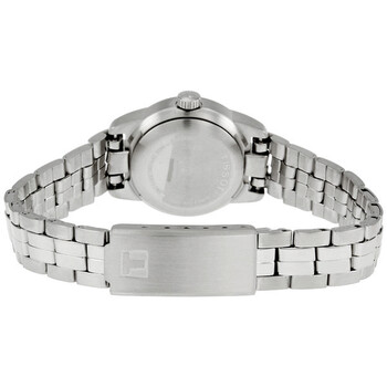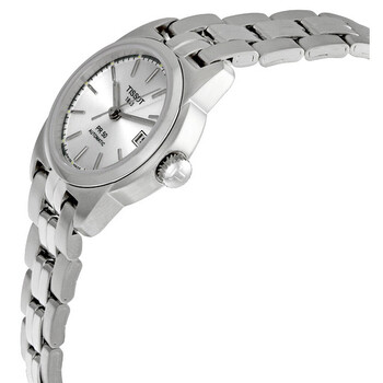 Stainless steel case with a stainless steel bracelet. Fixed stainless steel bezel. Silver dial with silver-tone hands and index hour markers. Minute markers around the outer rim. Date display at the 3 o'clock position. Automatic movement. Scratch resistant sapphire crystal. Solid case back. Case diameter: 28 mm. Case thickness: 6.6 mm. Deployment clasp. Water resistant at 50 meters / 165 feet. Functions: hours, minutes, seconds, calendar. Tissot PR50 Steel Silver Ladies Watch T34.1.283.31.