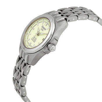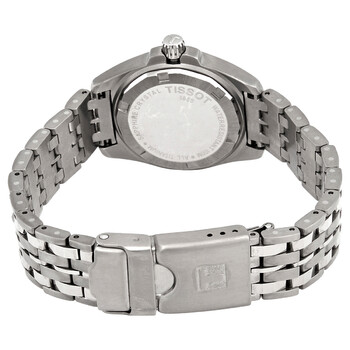 Grey titanium case with a grey titanium bracelet. Fixed grey titanium bezel. Ivory dial with luminous silver-tone hands and index hour markers. Arabic numeral minute markers (at 5 minute intervals). Minute markers around the outer rim. Dial Type: Analog. Luminescent hands and markers. Date display at the 3 o'clock position. ETA caliber F04.111 quartz movement. Scratch resistant sapphire crystal. Solid case back. Dodecagon case shape. Case size: 28 mm. Deployment clasp with a push button release. Water resistant at 100 meters / 330 feet. Functions: date, hour, minute, second. PRC 100 Series. Casual watch style. Watch label: Swiss Made. Item Variations: T008 010 44 261 00, T008-010-44-261-00, T008/010/44/261/00, T0080104426100. Tissot PRC 100 Quartz Ivory Dial Ladies Watch T008.010.44.261.00.