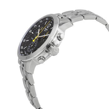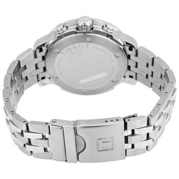 316L stainless steel case with a stainless steel bracelet. Fixed stainless steel bezel. Black dial with luminous silver-tone hands and index hour markers. An Arabic numeral appears at the 12 o'clock position. Minute markers. Tachymeter markings around the outer rim. Dial Type: Analog. Luminescent hands and markers. Date display between the 4 and 5 o'clock positions. Chronograph - three sub-dials displaying: 60 second, 30 minute and 1/10th of a second. ETA caliber G10.212 quartz movement. Scratch resistant sapphire crystal. Screw down crown. Solid case back. Round case shape. Case size: 42 mm. Case thickness: 12 mm. Band width: 20 mm. Fold over clasp with a safety release. Water resistant at 200 meters / 660 feet. Functions: chronograph, rattrapante, date, hour, minute, small second. Prc 200 Series. Sport watch style. Watch label: Swiss Made. Tissot PRC 200 Chronograph Quartz Black Dial Men's Watch T114.417.11.057.00.