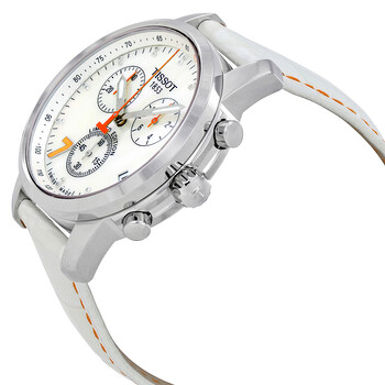 Stainless steel case with a white (calf-skin) leather strap with contrast stiching. Fixed stainless steel bezel. Mother of pearl dial with luminous silver-tone hands and diamond hour markers. Orange Arabic numeral marks the 7 o'clock position. Minute markers. Tachymeter around the outer rim. Dial Type: Analog. Luminescent hands and markers. Date display at the 4 o'clock position. Chronograph - three sub-dials displaying: seconds, 30 minutes and 1/10 th of a second. Swiss quartz movement. Scratch resistant mineral crystal. Solid case back. Case diameter: 43 mm. Case thickness: 12.5 mm. Band width: 11 mm. Deployment clasp. Water resistant at 200 meters / 660 feet. Functions: hours, minutes, seconds, chronograph, tachymeter, date. Casual watch style. Tissot PRC 200 Danica Patrick Chronograph Diamond Ladies Watch T0144171611600.