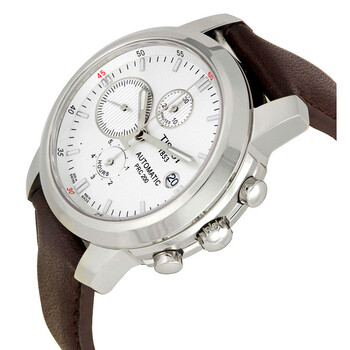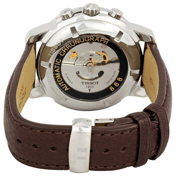 Stainless steel case with a brown leather strap. Fixed stainless steel bezel. White dial with luminous silver-tone hands and stick hour markers. Minute markers around the outer rim. GMT scale. Dial Type: Analog. Luminescent hands and dial markers. Date display at the 3 o'clock position. Chronograph - three sub-dials displaying: 60 seconds, 30 minutes and 6 hours. Automatic movement. Scratch resistant mineral crystal. Screw down crown. Skeleton case back. Case diameter: 42 mm. Case thickness: 15.8 mm. Band width: 15 mm. Tang clasp. Water resistant at 200 meters / 660 feet. Functions: hours, minutes, seconds, date, chronograph. Sport watch style. Watch label: Switzerland. Tissot PRC 200 Men's Watch T014.427.16.031.00.