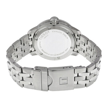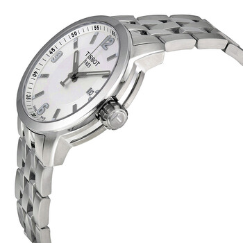 Stainless steel case with a stainless steel bracelet. Fixed stainless steel bezel. White dial with silver-tone hands and index hour markers. Arabic numerals mark the 3, 6, 9 and 12 o'clock positions. Minute markers around the outer rim. Dial Type: Analog. Luminescent hands and markers. Date display at the 3 o'clock position. Quartz movement. Scratch resistant sapphire crystal. Screw down crown. Solid case back. Case dimensions: 42 mm x 41 mm. Case thickness: 19 mm. Round case shape. Bracelet width: 19 mm. Deployment clasp. Water resistant at 200 meters / 660 feet. Functions: date, hour, minute, second. Luxury watch style. Tissot PRC 200 White Dial Stainless Steel Men's Watch T0554101101700.