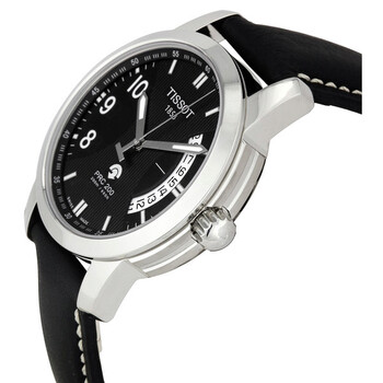 Stainless steel case with a black leather strap. Fixed bezel. Black dial. Dial Type: Analog. Auto-quartz movement. Scratch resistant sapphire crystal. Case size: 38.1mm. Case thickness: 14.6mm. Round case shape. Butterfly buckle clasp. Water resistant at 200 meters (660 feet). Functions: date, hours, minutes, seconds. Casual watch style. Watch label: Swiss made. Item Variations: T0144211605700. Tissot PRC200 Men's Autoquartz Watch T014.421.16.057.00.