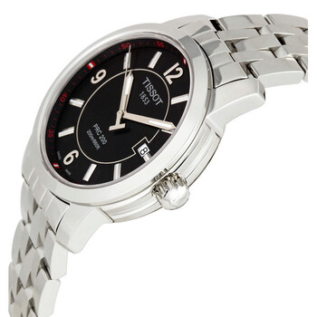 Stainless steel case with a stainless steel bracelet. Fixed stainless steel bezel. Black dial with luminous hands and stick hour markers. Arabic numerals mark the 6, 9 and 12 o'clock positions. Minute markers around the outer rim. Luminescent hands and markers. Date displays at the 3 o'clock position. Quartz movement. Scratch resistant sapphire crystal. Textured steel crown. Solid case back. Case diameter: 40 mm. Case thickness: 10.5 mm. Fold over deployment clasp with push button release. Water resistant at 200 meters / 660 feet. Functions: hours, minutes, seconds, date. Tissot PRC200 Men's Watch T014.410.11.057.00.