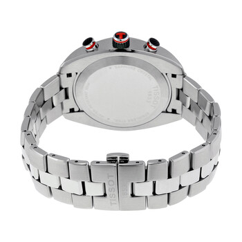 Stainless steel case with a stainless steel bracelet. Fixed stainless steel bezel showing tachymeter markings. Anthracite dial with luminous hands and index hour markers. An Arabic numeral marks the 12 o'clock position. Minute markers around the outer rim. Dial Type: Analog. Luminescent hands and markers. Date display at the 4 o'clock position. Chronograph - three sub-dials displaying: 60 second, 30 minute and 1/10th of a second. Quartz movement. Scratch resistant sapphire crystal. Solid case back. Case diameter: 44 mm. Case thickness: 11.42 mm. Round case shape. Butterfly clasp. Water resistant at 100 meters / 330 feet. Functions: chronograph, date, hour, minute, second. Casual watch style.