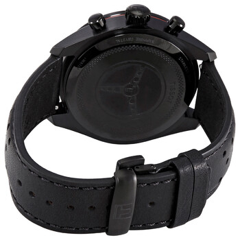 Black PVD coating stainless steel case with a black leather strap. Fixed black PVD bezel showing tachymeter marking Black dial with luminous silver-tone hands and Arabic numeral hour markers. Minute markers around the outer rim. Dial Type: Analog. Luminescent hands and markers. Date display at the 6 o'clock position. Chronograph - three sub-dials displaying: 60 second, 30 minute and 1/10th of a second. ETA caliber G10.212 quartz movement. Scratch resistant sapphire crystal. Solid case back. Round case shape. Case size: 45 mm. Case thickness: 12.1 mm. Band width: 22 mm. Butterfly clasp. Water resistant at 100 meters / 330 feet. Functions: chronograph, rattrapante, date, hour, minute, small second. PRS 516 Series. Sport watch style. Watch label: Swiss Made. Tissot PRS 516 Chronograph Quartz Black Dial Men's Watch T131.617.36.052.00.