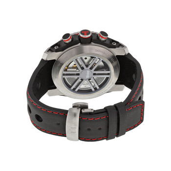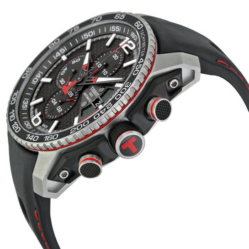 Silver-tone stainless steel case with a black leather strap. Fixed silver-tone stainless steel with a black PVD with tachymeter markings bezel. Black dial with luminous hands and index hour markers. Arabic numerals mark the 6 and 12 o'clock positions. minute markers around the outer rim. Dial Type: Analog. Luminescent hands and markers. Date display at the 3 o'clock position. Chronograph - three sub-dials displaying: 60 second, 30 minute and 6 hour. ETA Caliber C01.211 automatic movement with a 46-hour power reserve. Scratch resistant sapphire crystal. Pull / push crown. Skeleton case back. Round case shape, case size: 44.4 mm, case thickness: 17 mm. Band width: 22 mm, band length: 8 inches. Butterfly with push button release clasp. Water resistant at 100 meters / 330 feet. Functions: chronograph, date, hour, minute, second, tachymeter. Sport watch style. Watch label: Swiss Made. Tissot PRS 516 Extreme Automatic Chronograph Men's Watch T0794272605700.