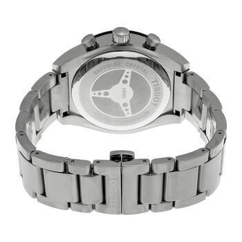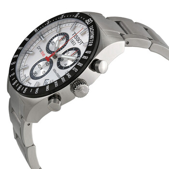 Stainless steel case with a stainless steel bracelet. Black ion-plated bezel showing tachymeter markings. Silver dial with luminous hands and stick hour markers. Minute markers around the outer rim. Date displays between the 4 and 5 o'clock positions. Chronograph - three sub-dials displaying: 30 minutes, 60 seconds and 1/10th of a second. Quartz movement. Scratch resistant sapphire crystal. Solid case back. Case diameter: 42 mm. Case thickness: 11.34 mm. Push button deployment clasp. Water resistant at 100 meters/330 feet. Functions: hours, minutes, seconds, date, chronograph, tachymeter. Tissot PRS516 Chronograph Men's Watch T0444172103100.
