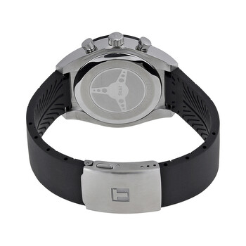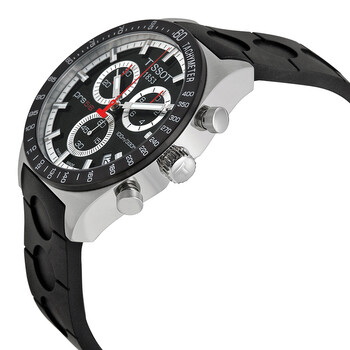 Stainless steel case with a black rubber strap. Fixed black ion-plated bezel showing with tachmeter markings. Black dial with luminous silver-tone hands and index hour markers. Minute markers around the outer rim. Luminescent hands and markers. Date display appears between the 4 and 5 o'clock positions. Chronograph - three sub-dials displaying: 1/10th seconds, 30 minutes and 60 seconds. Quartz movement. Scratch resistant sapphire crystal. Solid case back. Case diameter: 42 mm. Deployment clasp. Water resistant at 100 meters/ 330 feet. Functions: hours, minutes, seconds, date, chronograph, tachymeter. Tissot PRS516 Chronograph Men's Watch T044.417.27.051.00.