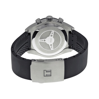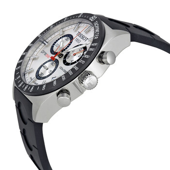 Stainless steel case with a black rubber strap. Fixed stainless steel bezel with a black ion-plated top ring showing tachymeter markings. Silver dial with luminous hands and stick hour markers. Minute markers around the outer rim. Date display between the 4 and 5 o'clock positions. Chronograph - three sub-dials displaying: 60 seconds, 30 minutes and 1/10th of a second. Quartz movement. Scratch resistant sapphire crystal. Textured steel crown. Solid case back. Case diameter: 42 mm. Case thickness: 11 mm. Deployment clasp. Water resistant at 100 meters / 330 feet. Tissot PRS 516 Men's Watch 0444172703100.