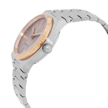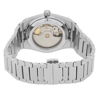 Silver-tone stainless steel case and bracelet. Fixed rose gold-tone 18kt rose gold bezel. Grey dial with rose gold-tone hands and diamond hour markers. Minute markers around the outer rim. Dial Type: Analog. Luminescent hands. Date display at the 3 o'clock position. Powermatic 80.111 Automatic movement, containing 23 Jewels, bitting at 28800 vph, and has a power reserve of approximately 80 hours. Scratch resistant sapphire crystal. Transparent see through case back. Round case shape, case size: 35 mm. Fold over clasp with a safety release. Water resistant at 100 meters / 330 feet. Functions: date, hour, minute, second. Additional Info: 44 diamonds. Prx Series. Casual watch style. Watch label: Swiss Made. Tissot PRX Automatic Diamond Grey Dial Ladies Watch T931.207.41.336.00.
