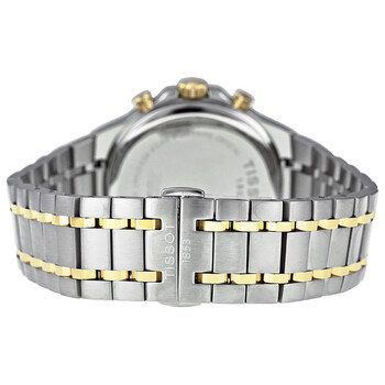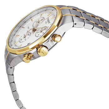 Stainless steel case with a two-tone (silver and gold-tone) stainless steel bracelet. Fixed gold-tone bezel. White dial with gold-tone hands and index hour markers. Minute markers. tachymeter around the outer rim. Dial Type: Analog. Luminescent hands and markers. Date display at the 4 o'clock position. Chronograph - three sub-dials displaying: 60 second, 30 minute and 1/10th of a second. Quartz movement. Scratch resistant sapphire crystal. Pull / push crown. Solid case back. Case diameter: 40.3 mm. Case thickness: 10.92 mm. Round case shape. Hidden deployment clasp. Water resistant at 100 meters / 330 feet. Functions: chronograph, date, hour, minute, second. Casual watch style. Tissot PRX Classic Chronograph Two-tone Men's Watch T0774172203100.
