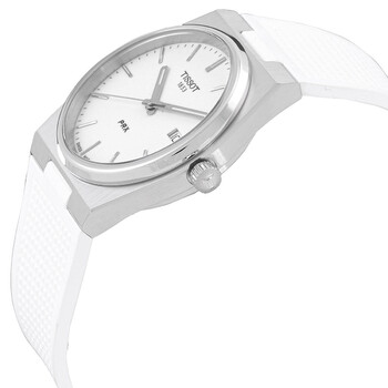 Silver-tone stainless steel case with a white rubber strap. Fixed silver-tone stainless steel bezel. White dial with silver-tone hands and index hour markers. Minute markers around the outer rim. Dial Type: Analog. Luminescent hands and markers. Date display at the 3 o'clock position. ETA Caliber F06.115 quartz movement. Scratch resistant sapphire crystal. Pull / push crown. Solid case back. Tonneau case shape, case size: 40 mm, case thickness: 10.4 mm. Band width: 12 mm. Tang clasp. Water resistant at 100 meters / 330 feet. Functions: date, hour, minute, second, battery eol indicator. Prx Series. Casual watch style. Watch label: Swiss Made. Tissot PRX Quartz White Dial Men's Watch T137.410.17.011.00.