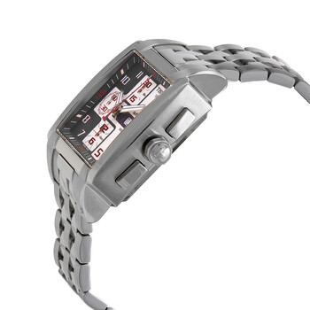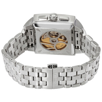 Stainless steel case with a stainless steel bracelet. Fixed stainless steel bezel. Black and white dial with silver-tone hands and Arabic numeral hour markers. Minute markers around the outer rim. Dial Type: Analog. Luminescent hands and markers. Day of the week and date display at the 3 o'clock position. Chronograph - three sub-dials displaying: 60 second, 30 minute and 12 hour. ETA-Valjoux caliber 7750 automatic movement, containing 25 Jewels, bitting at 28800 vph, and has a power reserve of approximately 44 hours. Scratch resistant sapphire crystal. Skeleton case back. Rectangle case shape. Case dimensions: 41 mm x 38 mm. Case thickness: 15 mm. Fold over clasp. Water resistant at 100 meters / 330 feet. Functions: chronograph, date, day, hour, minute, second. Quadrato Series. Sport watch style. Watch label: Swiss Made. Tissot Quadrato Chronograph Automatic Men's Watch T005.514.11.062.00.