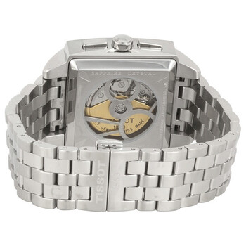 Stainless steel case with a stainless steel bracelet. Fixed stainless steel bezel. Black dial with luminous hands and index hour markers. Dial Type: Analog. Luminescent hands and markers. Day of the week and date display at the 3 o'clock position. Chronograph - three sub-dials displaying: 60 second, 30 minute and 12 hour. ETA-Valjoux caliber 7750 automatic movement, containing 25 Jewels, bitting at 28800 vph, and has a power reserve of approximately 44 hours. Scratch resistant sapphire crystal. Solid case back. Rectangle case shape. Case size: 40 mm. Case thickness: 15.25 mm. Band width: 22 mm. Deployment clasp. Water resistant at 100 meters / 330 feet. Functions: chronograph, day, date, hour, minute, second. Quadrato Series. Sport watch style. Watch label: Swiss Made. Item Variations: T0055141106100. Tissot Quadrato Men's Watch T005.514.11.061.00.