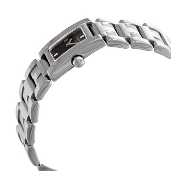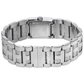 Silver-tone stainless steel case and bracelet. Fixed bezel. Black dial with silver-tone hands and index hour markers. Dial Type: Analog. Quartz movement. Scratch resistant sapphire crystal. Pull / push crown. Solid case back. Square case shape, case size: 21 mm. Deployment with push button release clasp. Water resistant at 30 meters / 100 feet. Functions: hour, minute. Dress watch style. Watch label: Swiss Made. Tissot Quartz Black Dial Ladies Watch T63.1.185.51.