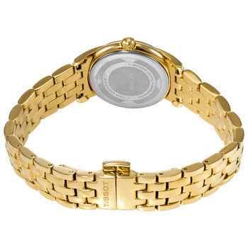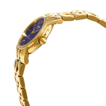 Gold-tone stainless steel case and bracelet. Fixed bezel. Blue dial with gold-tone hands and index-Arabic numerals hour markers. Dial Type: Analog. Date display at the 3 o'clock position. Quartz movement. Scratch resistant sapphire crystal. Pull / push crown. Solid case back. Round case shape, case size: 28 mm. Water resistant at 30 meters / 100 feet. Functions: date, hour, minute, second. Dress watch style. Watch label: Swiss Made. Tissot Quartz Blue Dial Ladies Watch T97.5.181.42.