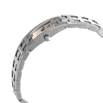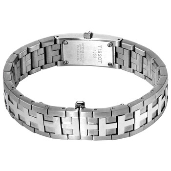 Stainless steel case with a stainless steel bracelet. Fixed stainless steel bezel set with diamonds. Silver dial with silver-tone hands. No markers. Dial Type: Analog. ETA caliber 280.002 quartz movement. Scratch resistant sapphire crystal. Pull / push crown. Solid case back. Rectangle case shape. Case dimensions: 21 mm x 14 mm. Case thickness: 5.65 mm. Band width: 14 mm. Fold over clasp with a safety release. Water resistant at 30 meters / 100 feet. Functions: hour, minute. Dress watch style. Watch label: Swiss Made. Tissot Quartz Diamond Silver Dial Ladies Watch T50.1.385.30.