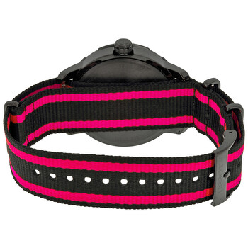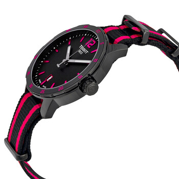Black PVD stainless steel case with a black and pink NATO nylon strap. Fixed black PVD top ring bezel. Black dial with luminous silver-tone hands and index hour markers. An Arabic numeral appears at the 12 o'clock position. Minute markers around the outer rim. Dial Type: Analog. Luminescent hands and markers. Date display above the 6 o'clock position. ETA caliber F06.111 quartz movement. Scratch resistant sapphire crystal. Pull / push crown. Solid case back. Round case shape. Case size: 40 mm. Case thickness: 9.12 mm. Band width: 19 mm. Tang clasp. Water resistant at 100 meters / 330 feet. Functions: date, hour, minute, second. Casual watch style. Watch label: Swiss Made. Tissot Quickster Black Dial Black and Hot Pink Nylon Ladies Watch T0954103705701.