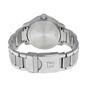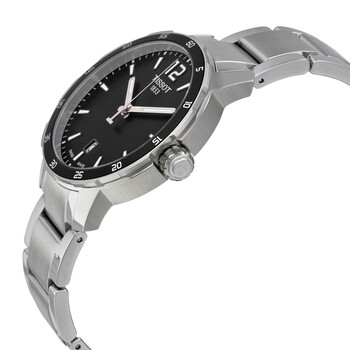 Stainless steel case with a silver-tone stainless steel bracelet. Fixed stainless steel with a black top ring bezel. Black dial with luminous silver-tone hands and index hour markers. Arabic numeral appears at the 12 o'clock position. minute markers around the outer rim. Dial Type: Analog. Luminescent hands and markers. Date display at the 6 o'clock position. ETA Caliber F06.111 quartz movement. Scratch resistant sapphire crystal. Solid case back. Round case shape, case size: 40 mm, case thickness: 9.12 mm. Band width: 20 mm, band length: 8 inches. Deployment clasp. Water resistant at 100 meters / 330 feet. Functions: date, hour, minute, second. Casual watch style. Watch label: Swiss Made. Tissot Quickster Black Dial Stainless Steel Men's Watch T0954101105700.