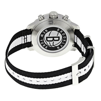 Stainless steel case with a black and white nylon strap. Fixed stainless steel bezel with a black top ring showing tachymeter markings. Silver dial with silver-tone hands and index hour markers. An Arabic numeral appears at the 12 o'clock position. Minute markers around the outer rim. Dial Type: Analog. Luminescent hands and markers. Date display at the 4 o'clock position. Chronograph - three sub-dials displaying: 60 second, 30 minute and 12 hour. Quartz movement. Scratch resistant sapphire crystal. Push / pull crown. Solid case back. Case size: 42 mm. Case thickness: 11.52 mm. Round case shape. Band width: 20 mm. Tang clasp. Water resistant at 100 meters / 330 feet. Functions: chronograph, tachymeter, date, hour, minute, second. Additional Info: Brooklyn Nets special edition. Suitable for snorkeling as well as swimming but not diving. Sport watch style. Watch label: Swiss Made. Tissot Quickster Brooklyn Nets Edition Chronograph Men's Watch T095.417.17.037.11.