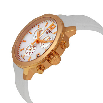 Gold-plated stainless steel case with a white silicone strap. Fixed gold-plated bezel. Mother of pearl dial with luminous gold-tone hands and index hour markers. An Arabic numeral appears at the 12 o'clock position. Minute markers around the outer rim. Dial Type: Analog. Luminescent hands and markers. Date display at the 4 o'clock position. Chronograph - three sub-dials displaying: 60 second, 30 minute and 1/10th of a second. Quartz movement. Scratch resistant sapphire crystal. Pull / push crown. Solid case back. Case diameter: 42 mm. Case thickness: 10.72 mm. Round case shape. Strap width: 18 mm. Tang clasp. Water resistant at 100 meters / 330 feet. Functions: chronograph, date, hour, minute, second. Sport watch style. Watch label: Swiss Made. Tissot Quickster Chronograph Mother Of Pearl Dial Ladies Sports Watch T0954173711700.