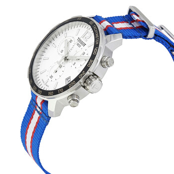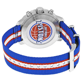 Stainless steel case with a navy khaki and red nylon NATO strap. Fixed stainless steel bezel with an inlaid black ring showing tachymeter markings. Silver dial with luminous silver-tone hands and index hour markers. An Arabic numeral appears at the 12 o'clock position. Minute markers around the outer rim. Dial Type: Analog. Luminescent hands and markers. Date display at the 4 o'clock position. Chronograph - three sub-dials displaying: 60 second, 30 minute and 12 hour. ETA caliber G10.211 quartz movement. Scratch resistant sapphire crystal. Solid case back. Case size: 42 mm. Case thickness: 10.72 mm. Round case shape. Tang clasp. Water resistant at 100 meters / 330 feet. Functions: chronograph, date, hour, minute, second, tachymeter. Sport watch style. Watch label: Swiss Made. Tissot Quickster Detroit Pistons Chronograph Men's Watch T095.417.17.037.22.