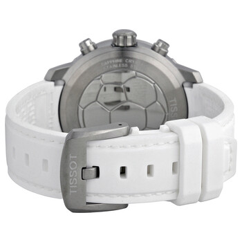 Stainless steel case with a white silicone strap. Fixed stainless steel bezel with grey top ring. Grey dial with luminous silver-tone hands and index hour markers. An Arabic numeral marks the 12 o'clock position. Minute markers around the outer rim. Dial Type: Analog. Luminescent hands and markers. Date display at the 4 o'clock position. Chronograph - three sub-dials displaying: 60 second, 60 minute and soccor period. ETA caliber G10.212 quartz movement. Scratch resistant sapphire crystal. Solid case back. Round case shape. Case size: 42 mm. Case thickness: 12 mm. Band width: 18 mm. Tang clasp. Water resistant at 100 meters / 330 feet. Functions: chronograph, rattrapante, date, hour, minute, small second. Casual watch style. Watch label: Swiss Made. Tissot Quickster Grey Dial White Silicone Men's Watch T0954491706700.