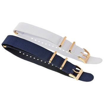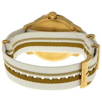 Rose gold-tone stainless steel case with a striped nylon strap. Fixed rose gold-tone bezel. Mother of pearl dial with luminous gold-toned hands and index hour markers. An Arabic numeral appears at the 12 o'clock position. Minute markers around the outer rim. Dial Type: Analog. Luminescent hands. Date display at the 6 o'clock position. Quartz movement. Scratch resistant sapphire crystal. Solid case back. Case diameter: 40 mm. Case thickness: 9.12 mm. Round case shape. Strap width: 19 mm. Tang clasp. Water resistant at 100 meters / 330 feet. Functions: date, hour, minute, second. Casual watch style. Watch label: Swiss Made. Tissot Quickster Mother of Pearl Dial Striped Nylon Strap 40mm Watch T0954103711700.