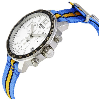 Stainless steel case with a blue navy and yellow nylon NATO strap. Fixed stainless steel bezel with a black PVD top ring showing tachymeter markings. Silver dial with luminous silver-tone hands and index hour markers. An Arabic numeral appears at the 12 o'clock position. Minute markers around the outer rim. Dial Type: Analog. Luminescent hands and markers. Date display at the 4 o'clock position. Chronograph - three sub-dials displaying: 60 second, 30 minute and 12 hour. ETA Caliber G10.211 quartz movement. Scratch resistant sapphire crystal. Solid case back. Case size: 42 mm. Case thickness: 10.72 mm. Round case shape. Tang clasp. Water resistant at 100 meters / 330 feet. Functions: chronograph, date, hour, minute, second, tachymeter. Sport watch style. Watch label: Swiss Made. Tissot Quickster NBA Denver Nuggets Chronograph Men's Watch T095.417.17.037.25.