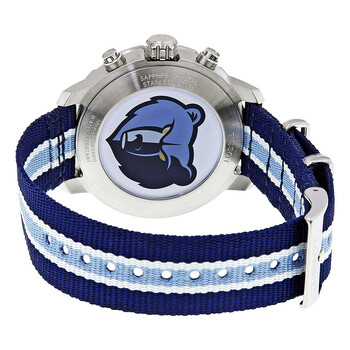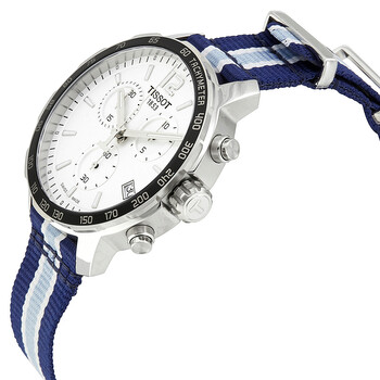 Stainless steel case with a navy grey and blue NATO nylon strap. Fixed stainless steel bezel with a black top ring showing tachymeter markings. Silver dial with luminous silver-tone hands and index hour markers. An Arabic numeral appears at the 12 o'clock position. Minute markers around the outer rim. Dial Type: Analog. Luminescent hands and markers. Date display at the 4 o'clock position. Chronograph - three sub-dials displaying: 60 second, 30 minute and 12 hour. ETA caliber G10.211 quartz movement. Scratch resistant sapphire crystal. Pull / push crown. Solid case back. Round case shape. Case size: 42 mm. Case thickness: 10.72 mm. Band width: 20 mm. Tang clasp. Water resistant at 100 meters / 330 feet. Functions: chronograph, date, hour, minute, second, tachymeter. Military watch style. Watch label: Swiss Made. Tissot Quickster NBA Memphis Grizzlies Men's Watch T095.417.17.037.20.