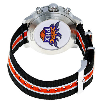 Stainless steel case with a brown white and orange nylon NATO strap. Fixed stainless steel bezel with a black top ring showing showing tachymeter markings. Silver dial with luminous silver-tone hands and index hour markers. An Arabic numeral appears at the 12 o'clock position. Minute markers around the outer rim. Dial Type: Analog. Luminescent hands and markers. Date display at the 4 o'clock position. Chronograph - three sub-dials displaying: 60 second, 30 minute and 12 hour. ETA Caliber G10.211 quartz movement. Scratch resistant sapphire crystal. Solid case back. Case size: 42 mm. Case thickness: 10.72 mm. Round case shape. Tang clasp. Water resistant at 100 meters / 330 feet. Functions: chronograph, date, hour, minute, second, tachymeter. Sport watch style. Watch label: Swiss Made. Tissot Quickster NBA Phoenix Suns Chronograph Men's Watch T0954171703734.