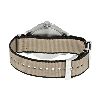 Stainless steel case with a gray and black NATO nylon strap. Fixed stainless steel bezel with a black top ring. Silver dial with luminous silver-tone hands and index hour markers. An Arabic numeral appears at the 12 o'clock position. Minute markers around the outer rim. Dial Type: Analog. Luminescent hands and markers. Date display at the 4 o'clock position. ETA caliber F06.111 quartz movement. Scratch resistant sapphire crystal. Screw down crown. Solid case back. Round case shape. Case size: 42 mm. Case thickness: 10.72 mm. Band width: 20 mm. Band length: 8 inches. Tang clasp. Water resistant at 100 meters / 330 feet. Functions: date, hour, minute, second. Casual watch style. Watch label: Swiss Made. Tissot Quickster Silver Dial Men's Watch T0954101703700.