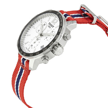 Wear your team on your wrist. Here is the NBA Washington Wizards. Stainless steel case with a red white and navy nylon NATO strap. Fixed stainless steel bezel with a black top ring showing tachymeter markings. Silver dial with luminous silver-tone hands and index hour markers. An Arabic numeral appears at the 12 o'clock position. Minute markers around the outer rim. Dial Type: Analog. Luminescent hands and markers. Date display at the 4 o'clock position. Chronograph - three sub-dials displaying: 60 second, 30 minute and 12 hour. ETA Caliber G10.211 quartz movement. Scratch resistant sapphire crystal. Solid case back. Case size: 42 mm. Case thickness: 10.72 mm. Round case shape. Strap width: 19 mm. Tang clasp. Water resistant at 100 meters / 330 feet. Functions: chronograph, date, hour, minute, second, tachymeter. Sport watch style. Watch label: Swiss Made. Tissot Quickster Washington Wizards Chronograph Men's Watch T0954171703732.