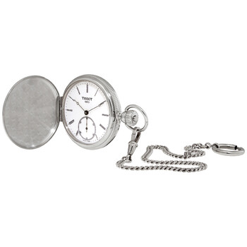 Stainless steel case. Fixed stainless steel bezel. White dial with black hands and index hour markers. Minute markers around the outer rim. Dial Type: Analog. One subdial displaying: small seconds. ETA caliber 6498-1 hand wind movement, containing 17 Jewels, bitting at 19800 vph, and has a power reserve of approximately 46 hours. Scratch resistant hesalite mineral crystal. Solid case back. Round case shape. Case size: 48.5 mm. Case thickness: 11.6 mm. Functions: hour, minute, small second. Savonnette Series. Casual watch style. Watch label: Swiss Made. Tissot Savonnette Hand Wind White Dial Men's Pocket Watch T867.405.19.013.00.