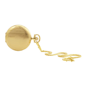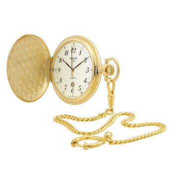 Gold-tone brass case. Fixed gold-tone brass bezel. White dial with black hands and Arabic numeral hour markers. Minute markers around the outer rim. Dial Type: Analog. Date display at the 6 o'clock position. One subdial displaying: small second. Quartz movement with a 53-hour power reserve. Scratch resistant mineral crystal. Solid case back. Round case shape. Water resistant at 30 meters / 100 feet. Functions: date, hour, minute, second. Savonnette Series. Watch label: Swiss Made. Tissot Savonnette Quartz White Dial Watch T83.4.553.12.
