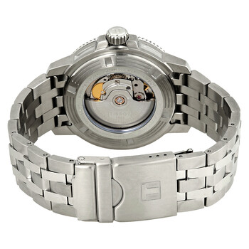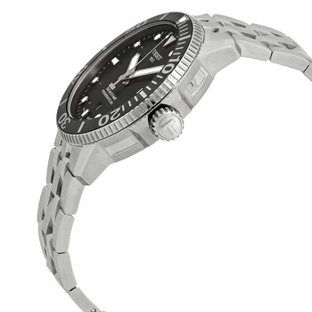 Silver-tone stainless steel case and bracelet. Uni-directional rotating silver-tone stainless steel with a black ceramic ring bezel. Black dial with luminous silver-tone hands and dot hour markers. Minute markers around the outer rim. Dial Type: Analog. Luminescent hands and markers. Date display at the 6 o'clock position. Tissot Calibre Powermatic 80 (C07.111) Automatic movement, based upon ETA 2824-2, containing 23 Jewels, bitting at 21600 vph, and has a power reserve of approximately 80 hours. Scratch resistant sapphire crystal. Screw down crown. Transparent case back. Round case shape, case size: 43 mm, case thickness: 12.7 mm. Band width: 21 mm. Fold over clasp with a push button release. Water resistant at 300 meters / 1000 feet. Functions: date, hour, minute, second. Seastar 1000 Series. Dive watch style. Watch label: Swiss Made. Tissot Seastar 1000 Automatic Black Dial Men's Watch T1204071105100.