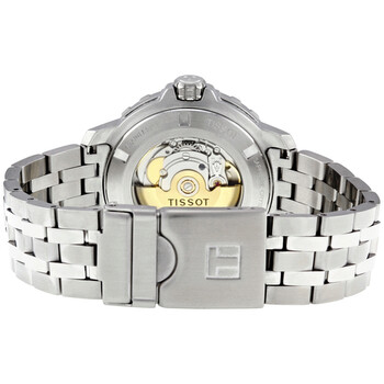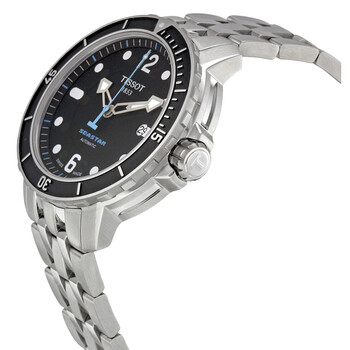 Stainless steel case with a stainless steel bracelet. Black PVD bezel. Black dial with luminous hands and dot hour markers. Arabic numerals mark the 6 and 12 o'clock positions. Minute markers around the outer rim. Dial Type: Analog. Luminescent hands and markers. Date display at the 3 o'clock position. Swiss automatic movement. Scratch resistant sapphire crystal. Skeleton case back. Case diameter: 42 mm. Case thickness: 12 mm. Band width: 19 mm. Fold over clasp with safety release. Water resistant at 300 meters / 1000 feet. Casual watch style. Tissot Seastar Black Dial Men's Watch T0664071105700.