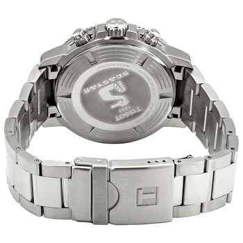 Stainless steel case with a stainless steel bracelet. Uni-directional rotating stainless steel bezel with a black aluminium inlay. Black dial with luminous silver-tone hands and dot hour markers. Minute markers around the outer rim. Dial Type: Analog. Luminescent hands and markers. Date display between the 4 and 5 o'clock positions. Chronograph - three sub-dials displaying: 60 second, 30 minute and 1/10th of a second. ETA caliber G10.212 quartz movement. Scratch resistant sapphire crystal. Screw down crown. Solid case back. Round case shape. Case size: 45.5 mm. Case thickness: 12.8 mm. Band width: 22 mm. Fold over clasp with a safety release. Water resistant at 300 meters / 1000 feet. Functions: chronograph, rattrapante, date, hour, minute, small second. Dive watch style. Watch label: Swiss Made. Tissot Seastar 1000 Chronograph Quartz Men's Watch T1204171105100.