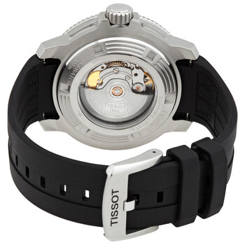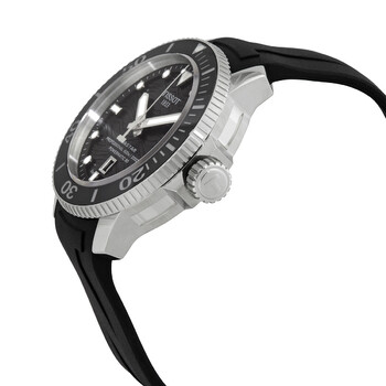 Stainless steel case with a black rubber strap. Uni-directional rotating stainless steel bezel with an inlaid black ceramic ring. Grey gradient dial with luminous silver-tone hands and dot hour markers. Minute markers around the outer rim. Dial Type: Analog. Luminescent hands and markers. Date display above the 6 o'clock position. Caliber POWERMATIC 80.111 automatic movement with an 80-hour power reserve. Scratch resistant sapphire crystal. Screw down crown. Transparent case back. Round case shape. Case size: 46 mm. Case thickness: 16.25 mm. Band width: 22 mm. Tang clasp. Water resistant at 600 m / 2000 ft. Functions: date, hour, minute, second. Seastar 2000 Series. Dive watch style. Watch label: Swiss Made. Tissot Seastar 2000 Automatic Grey Dial Men's Watch T120.607.17.441.00.