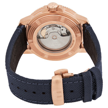 Rose gold PVD stainless steel case with a blue textile strap. Uni-directional rotating rose gold PVD bezel with an inlaid black ceramic ring. Blue dial with luminous rose gold-tone hands and dot hour markers. Minute markers around the outer rim. Dial Type: Analog. Luminescent hands and markers. Date display above the 6 o'clock position. Caliber POWERMATIC 80.111 automatic movement with an 80-hour power reserve. Scratch resistant sapphire crystal. Screw down crown. Transparent case back. Round case shape. Case size: 43 mm. Case thickness: 12.7 mm. Band width: 20 mm. Butterfly clasp. Water resistant at 300 meters / 1000 feet. Functions: date, hour, minute, second. Seastar Series. Dive watch style. Watch label: Swiss Made. Tissot Seastar Automatic Blue Dial Men's Watch T120.407.37.041.00.
