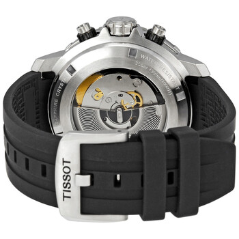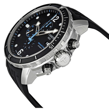 Stainless steel case with a black rubber strap. Unidirectional black PVD bezel. Black dial with luminous arrow hands and dot hour markers. Arabic numerals mark the 6 and 12 o'clock positions. Minute markers around the outer rim. Dial Type: Analog. Luminescent hands and markers. Date display at the 3 o'clock position. Chronograph - three sub-dials displaying: seconds, 30 minutes and 12 hours. Swiss automatic movement with a 45 hour power reserve. Scratch resistant sapphire crystal. Screw down crown. Skeleton case back. Case diameter: 48 mm. Case thickness: 17 mm. Band width: 11 mm. Tang clasp. Water resistant at 300 meters / 1000 feet. Functions: hours, minutes, seconds, chronograph, date. Casual watch style. Tissot Seastar Chronograph Automatic Black Dial Men's Watch T0664271705700.